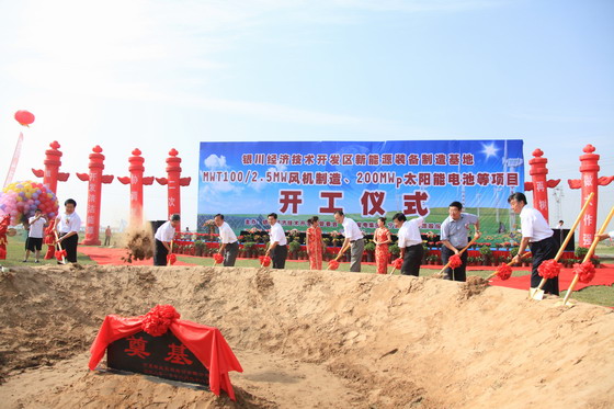 6月28日,总投资23亿元的9个新能源装备制造项目在银川高新技术开发区新能源装备制造基地正式开工。自治区党委书记陈建国、政府主席王正伟、银川市委书记崔波、市长王儒贵、宁夏发电集团董事长刘应宽、总经理何怀兴以及区、市、银川开发区和宁夏发电集团、中能叶片、九鼎机舱等有关单位、企业职工500多人参加了开工仪式。陈建国、王正伟为新能源装备制造基地揭牌。银星能源股份有限公司在此次开工的项目中,引进技术建设300台/年 MWT100/2.5MW风力发电机组项目计划投资5亿元,建成投产后可以全面提升我公司风电设备制造的整体技术水平,提高企业竞争力,同时带动区内装备制造业产值15亿元。扩建500台/年齿轮箱制造项目、扩建500套/年塔筒制造项目的实施,将进一步延伸公司风电产业链,使银川开发区成为陕甘宁蒙毗邻地区最大的风机构建制造基地。200MWp/年太阳能电池项目是技术含量较高的高科技产业项目,该项目计划投资6亿元,分两期建设,建成投产后将填补我区太阳能设备制造产业链的空白;500MWp/年光伏组件扩建项目和500MWp/年太阳能发电跟踪装置扩建项目的实施,也将使公司的太阳能制造产业链更加完整。银星能源股份有限公司6个项目建成达产后,可实现销售收入85亿元,实现新增就业3000人;这些项目产品用于发电后,相当于每年节约标准煤约82万吨,减少二氧化碳排放约209万吨/年,减少二氧化硫排放约17000吨/年,减少烟尘排量约18万吨/年。这些项目的建设对于加快我区产业结构调整,提速首府城市经济发展,建设绿色银川、和谐银川具有重要意义。